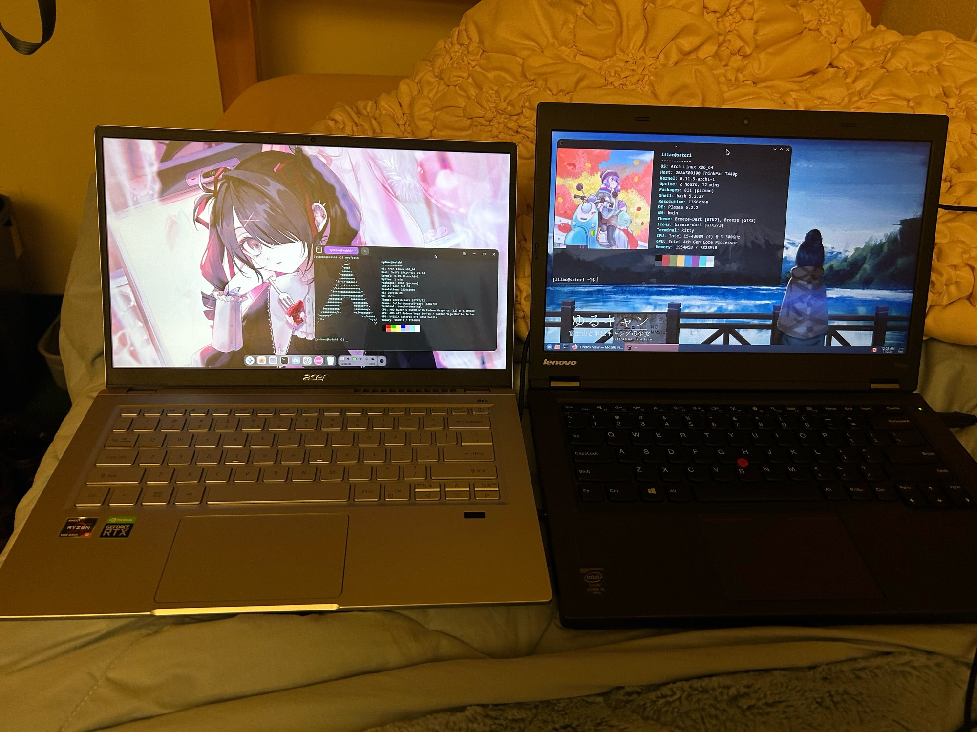 our computers, side by side~ mine is the thinkpad, sydney's is the acer swift :3